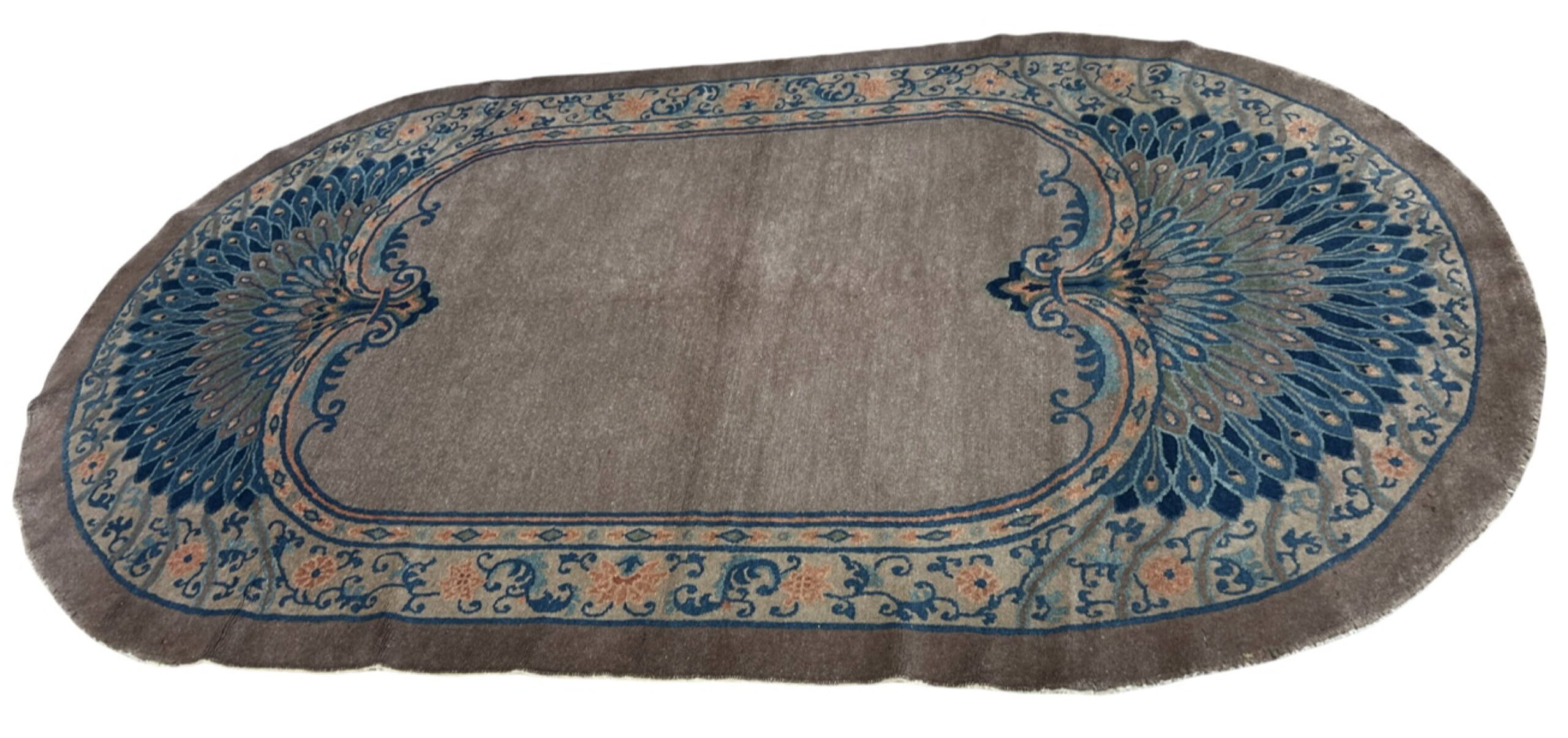 Great Looking Very Good Oval Antique Chinese Peking Rug with an Open Field Peacock Tailfeather Design; Made in China, 1900 – 1920’s